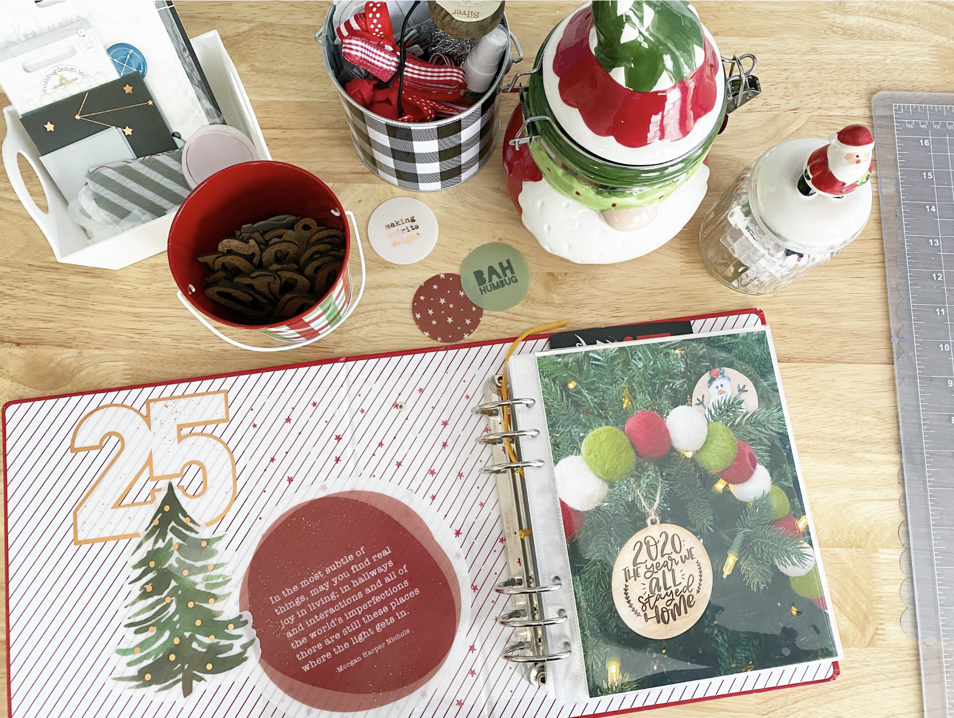 For 2020, I decided to up my own game with a December Daily cart and it’s definitely put me in the holiday spirit! I’d seen a couple on Instagram and I had an extra Raskog cart sitting around, so why not? I gathered up all my DD supplies, the current kit plus leftovers from previous years, all my Christmas stamps, ribbon, and anything festive, and placed them in little tins I found at Hobby Lobby. My mom had recently given me a tiny glass jar with Santa on the lid and I used him to store sparkly goodness. I added another Santa jar from Home Goods and stashed holiday M&Ms - where my husband won’t find and eat them all! On the top shelf, I have my 2020 album, my unfinished 2019 album, and my finished 2018 album for inspiration.